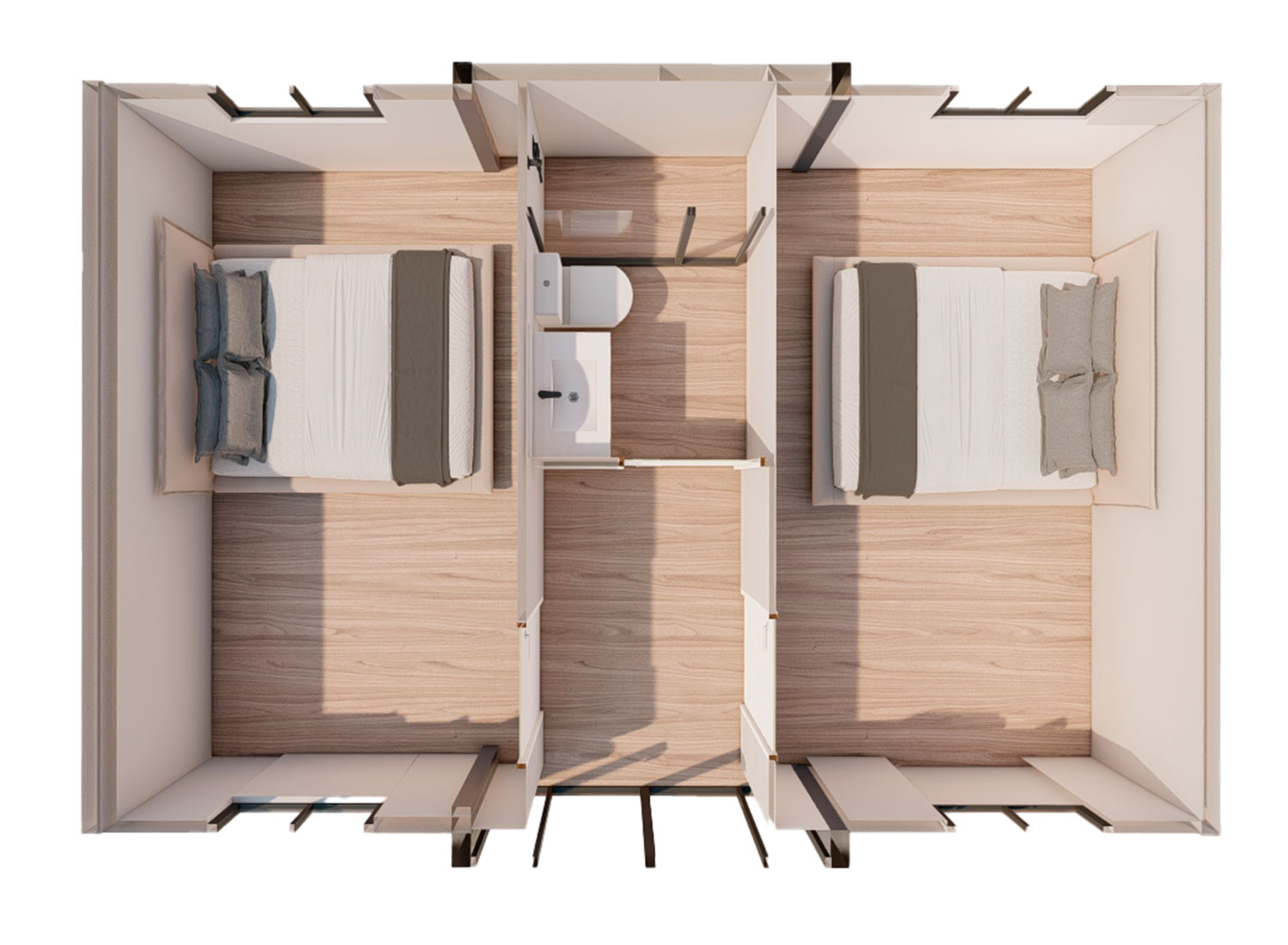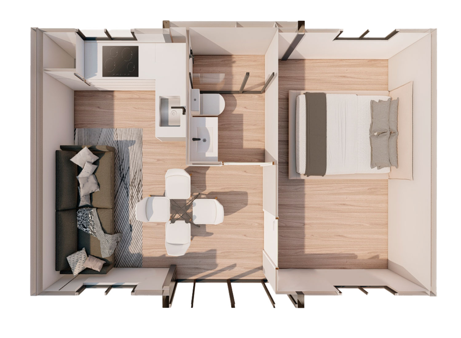 El baño tiene un estilo sencillo pero moderno y un enfoque práctico, ya que incluye un baño completo con todo lo necesario para el día a día. El WC, fabricado en cerámica blanca de primera calidad, se instala junto a la pared, lo que aporta un aire actual y despejado al entorno. La ducha, equipada con un plato rectangular y un rociador de gran tamaño, ofrece una sensación refrescante y cómoda, todo ello protegido por una mampara de vidrio templado que mantiene el espacio limpio y bien delimitado.